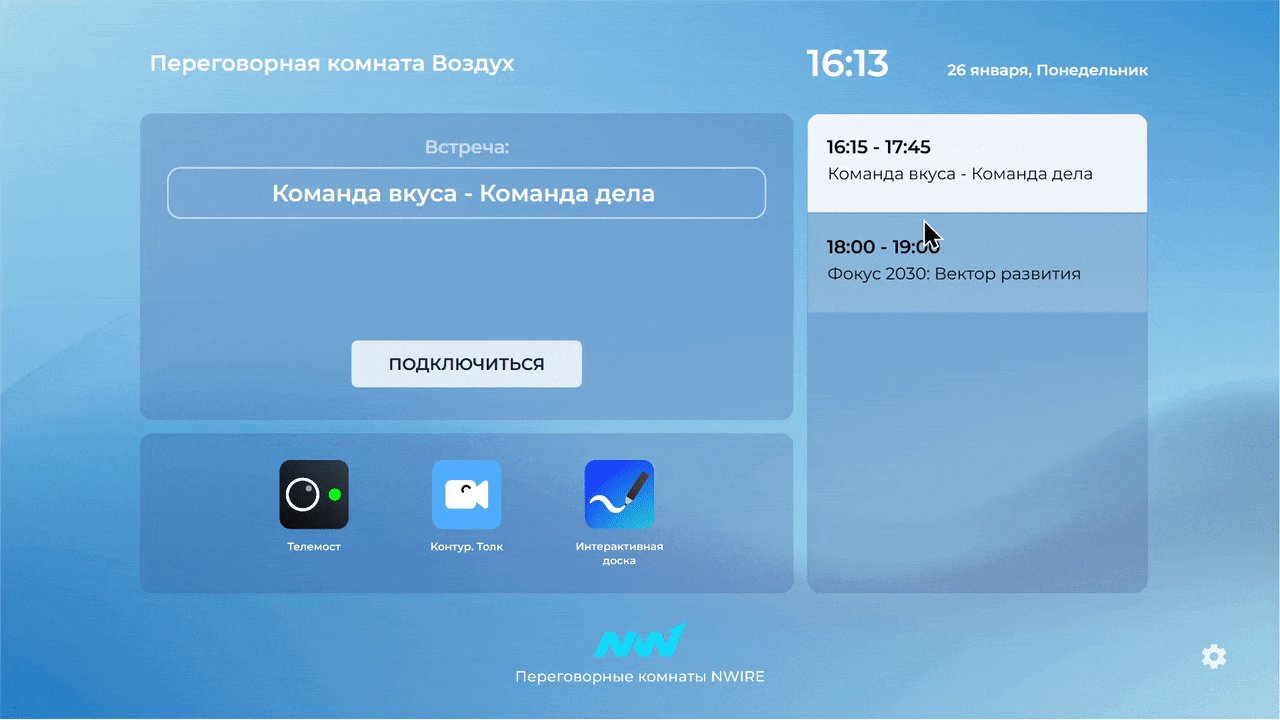 Переговорные комнаты NWIRE — это универсальное решение для переговорных комнат, которое позволяет использовать любые ВКС системы и корпоративные приложения в одном интерфейсе. Процесс работы с переговорными комнатами становится простым и понятным.