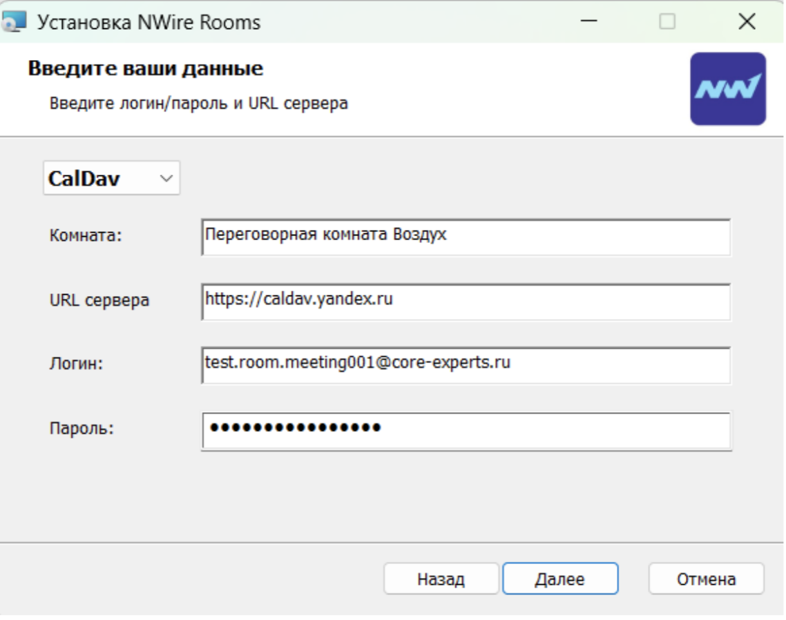 a. В левом верхнем углу выберите «CalDav» или «Exchange» для настройки в зависимости от того как устроены календари. b. Комната: название переговорной комнаты c. URL сервера: